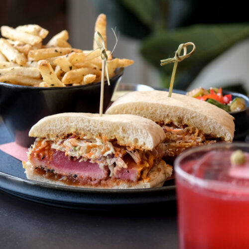 sesame-crusted ahi tuna, tomato & pink ginger jam, wasabi mayo, cabbage coleslaw, fried shallots, furikake french fries, spicy pickled cucumbers, butter toasted ciabatta