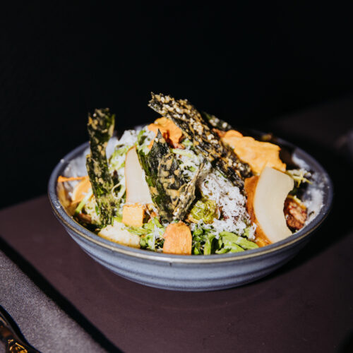 avocado, roasted winter squash, pickled red onion, truffled tofu sauce, crispy yam, micro greens